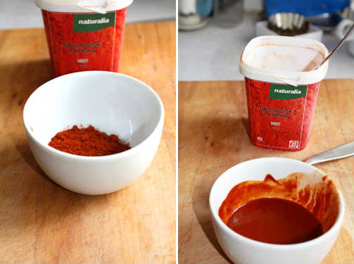 Sådan gør du: Bland 2 tsk. sød paprika og 2 spsk. vand til